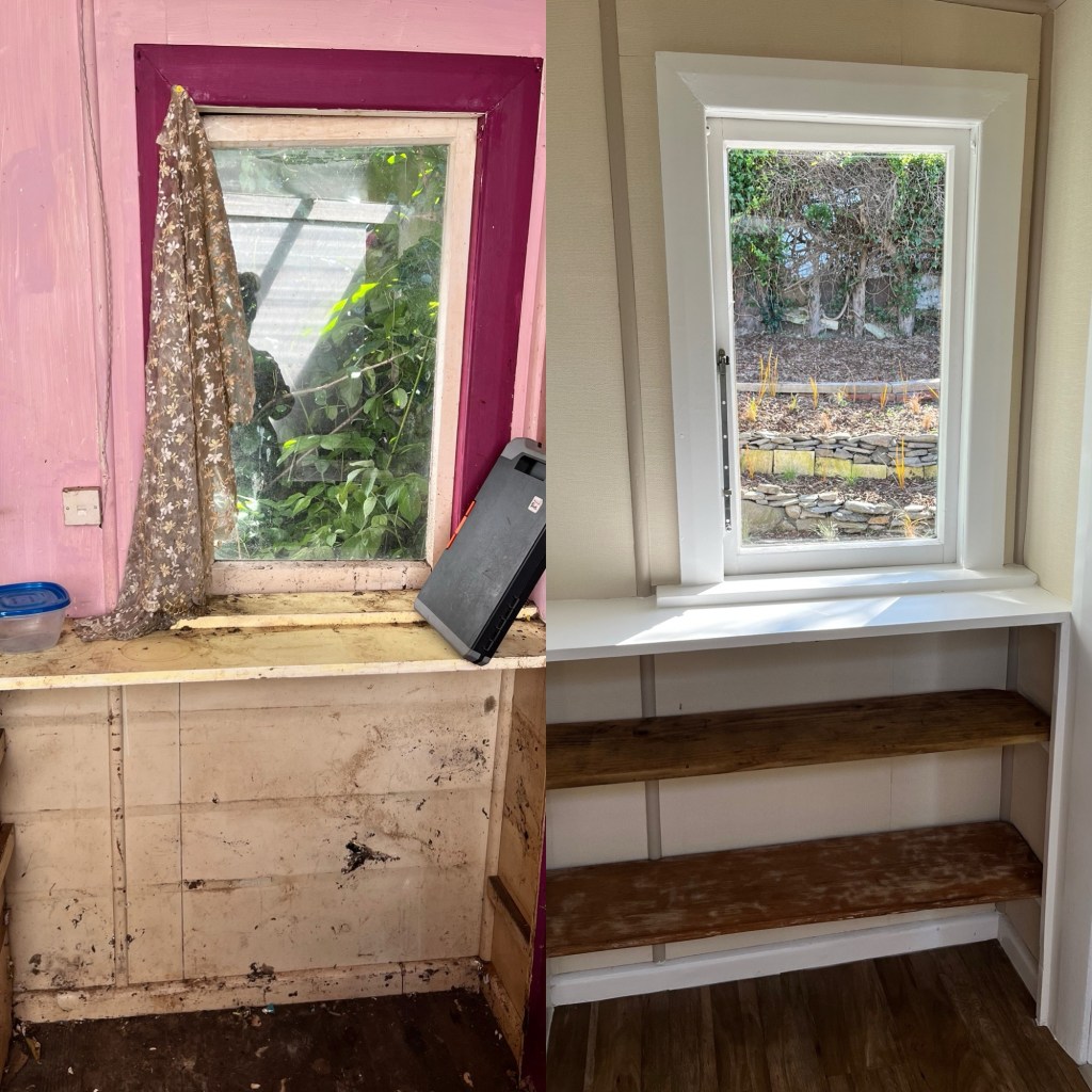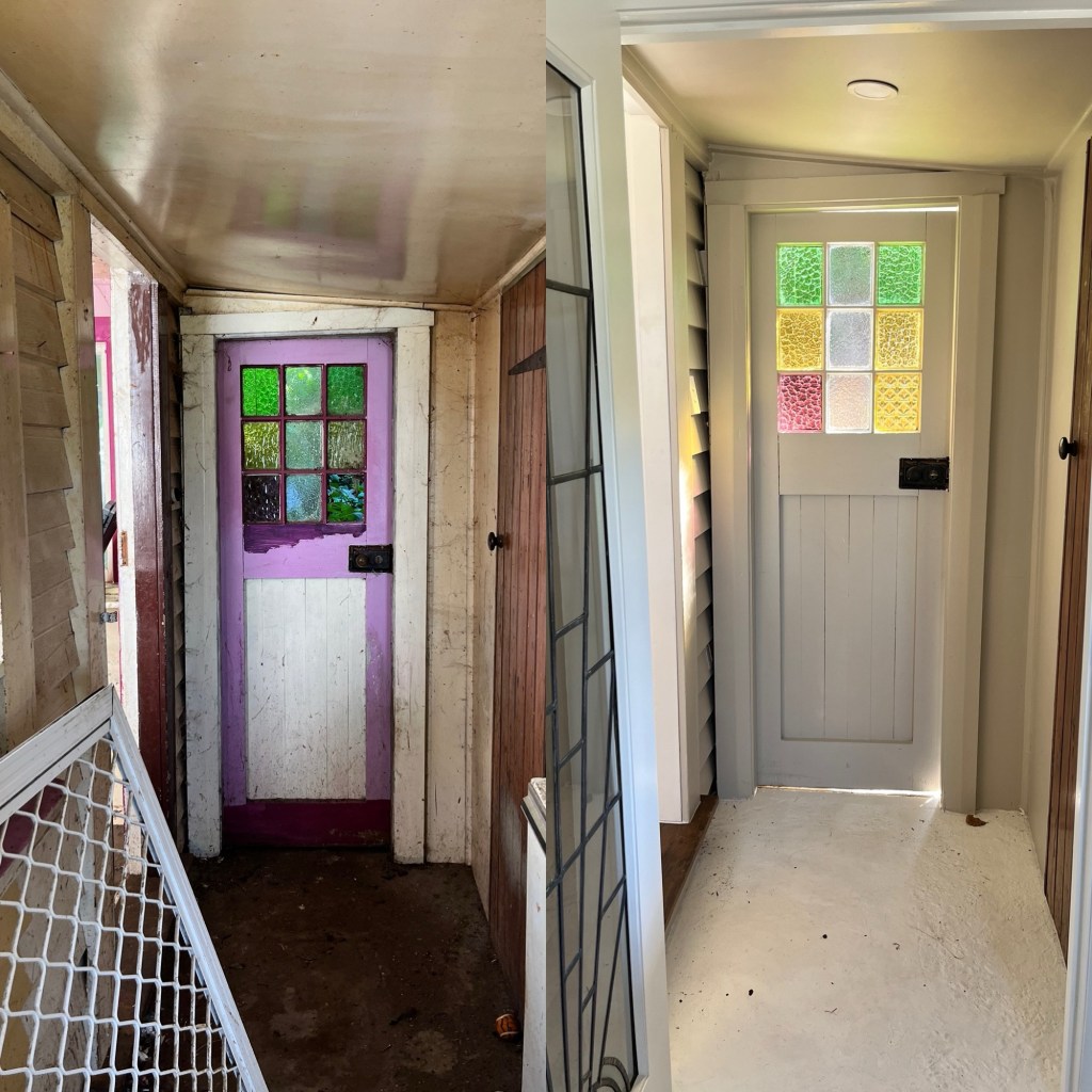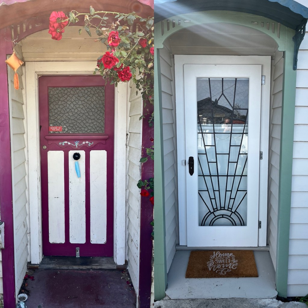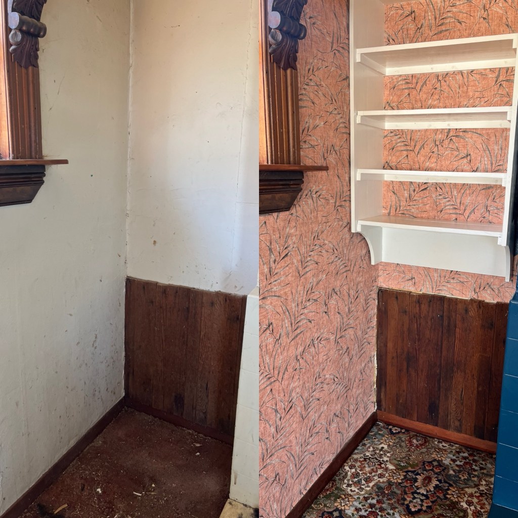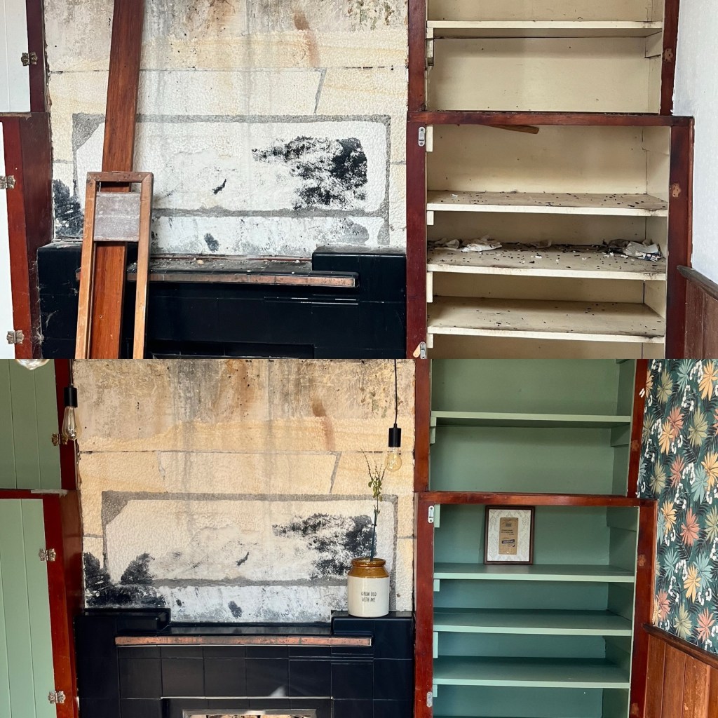 Friday; Fred is here today to fix the floor. He expertly fixes the bit I fell through haha. He also gets the shelves up next to the fireplace and finally new handle for our new glass front door. It looks better than I imagined. It is all coming together nicely. Cory finished off the undercoat on the fence. Which now looks much better. I try stay out of the way too and do jobs that are not getting in Freds way. I get some exterior paint touch ups done. I finish the toilet door paint. I spray some weeds and I try to put cayenne pepper in my sprayer to help stop the cats from pooping in my yard. It is a competition to who can claim my yard. They hate pepper so here we go. Oh it clogs up lol. We end up having another late night and end up having dinner again with Leona. Haha