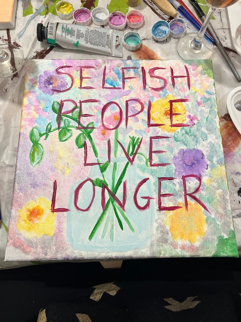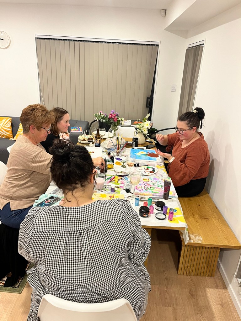 Saturday we headed back into central Auckland and waited at Emma’s house for Clare to come. It is great to see my mum and sister. Clare didn’t know I was here, we were trying to make me a surprise but she told me she had an idea I was here. We are celebrating Clare’s 40th Birthday this weekend. We all go out to lunch and then I leave Rowan at Emma’s with the cat. We head out to get massages and our nails all done. Ellery, Emma’s daughter gets her nails done too and she sits very still and waits for the polish to dry. We all head back to the airbnb and catchup. My youngest sister Sarah is flying in from Rotorua after she finished work. We end up having Thai food delivered for dinner. We made our own paint and sip. We decided the fake flowers would be our inspiration. I am not sure my message went down well on top of my flowers. I thought it was pretty accurate.