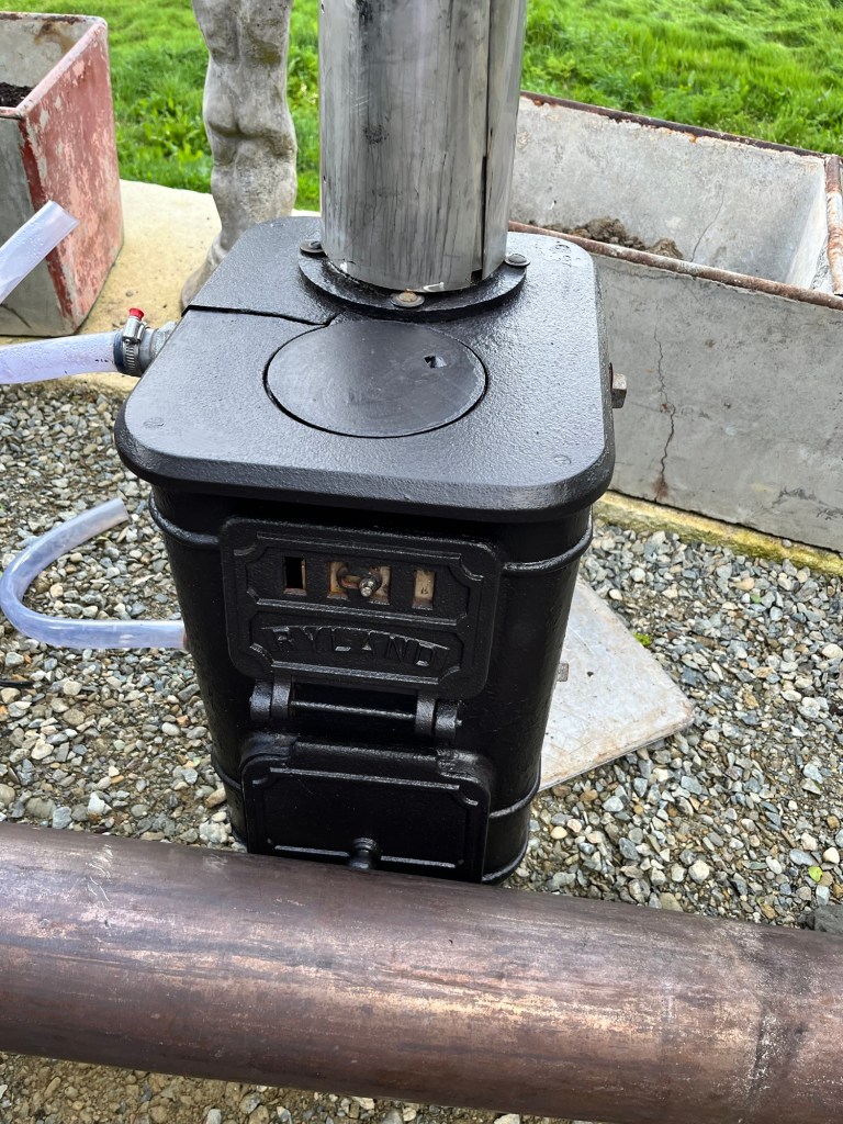 Monday, we have Cory here today. He is helping with jobs in Herbert. There are 3 baths I will use raised herb gardens. He finished off the garden edging, it is now looking tidy. Our week is only a vague plan at the moment as we are waiting for contractors to get back to us before we can really plan what we are doing. I get a few jobs done, I painted the moped that we got out of a garden in Timaru, Rowan put it on a stand. I started work on the pot belly stove. It has a few leaks in the water jacket. I hope the cement I used will do the trick. Won’t know for 48 hours.