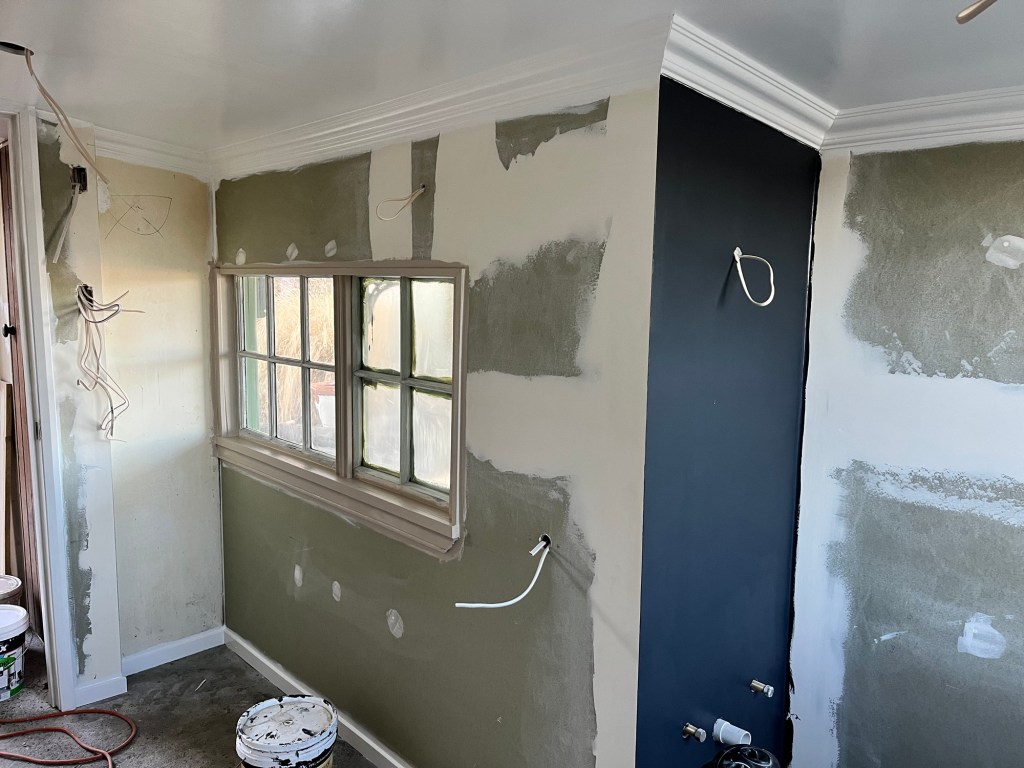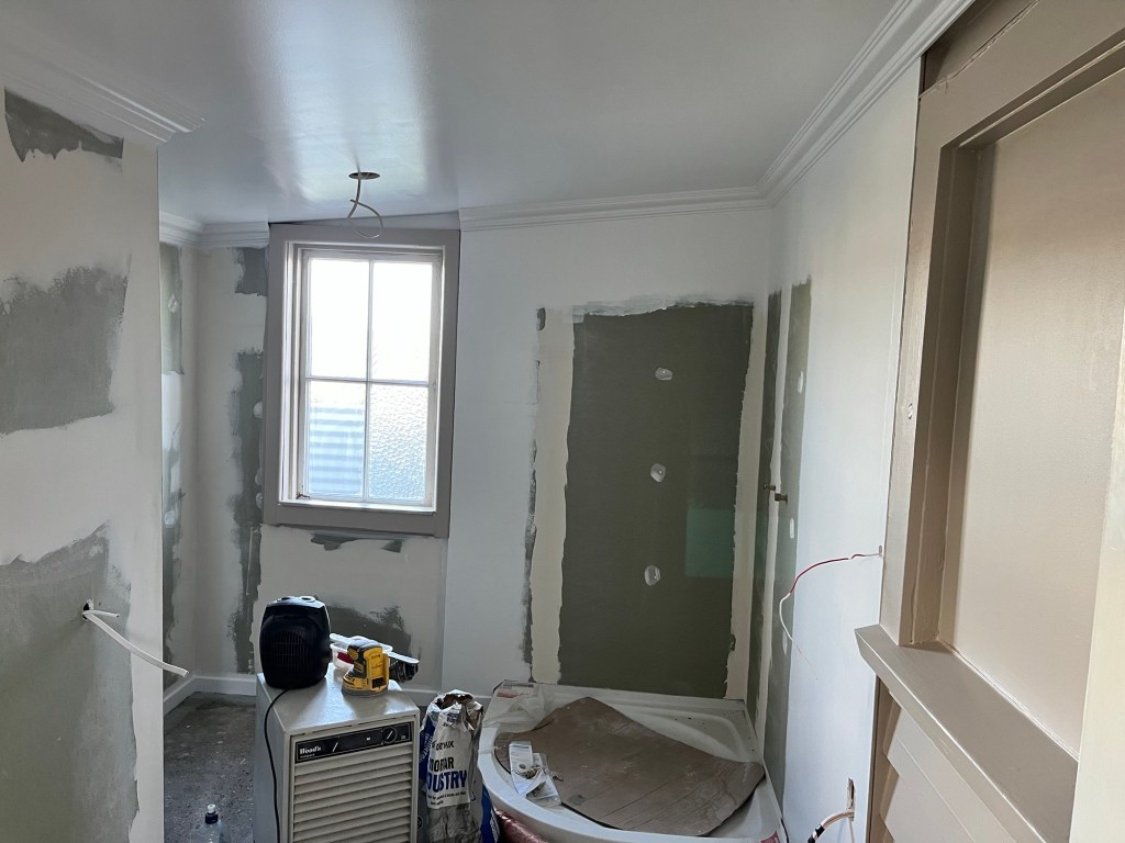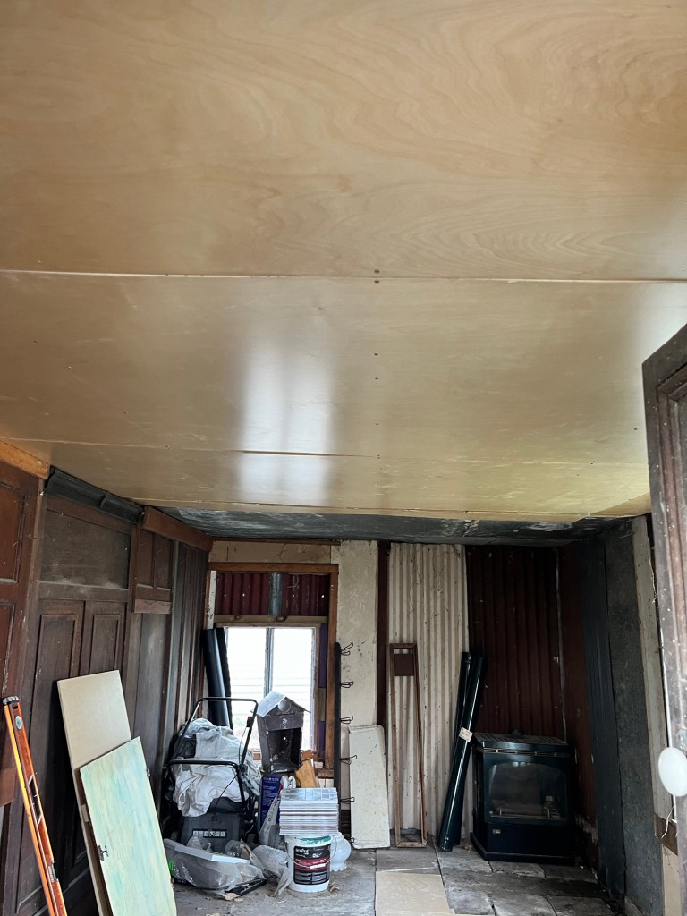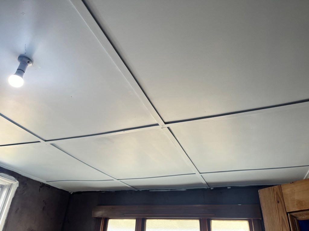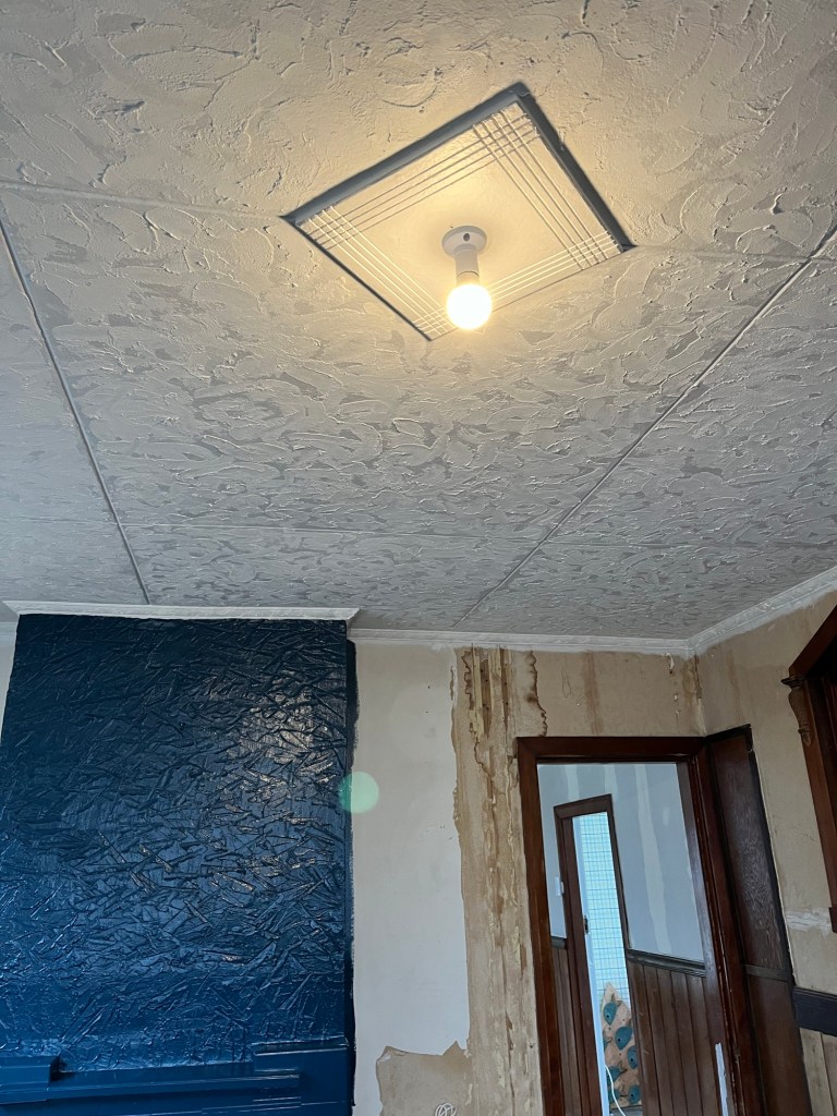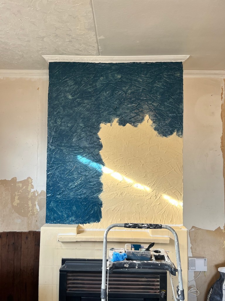 I got stuck in and finished the ceiling in the living room. It took me a moment to get into the swing of things as I couldn’t remember the consistency I made and the technique I used. Note to self, when doing something creative for the first time don’t stop haha. While I juggled that I did coats of paint on the door in the second bedroom. I got that ceiling done and Rowan popped in for tools and for some lunch. Jas is on wood putty filler, it is a full day for her. I then got the last coat of green on the shelves in the dining room. After that I got the last coat of blue on the fireplace. I was wallpapering the door when I realised the time and I better get going. I paid Jas and told her to shut the door behind her. I have an hour massage to get to. After the massage I went home to shower before going out to Herbert. All in all a productive day.