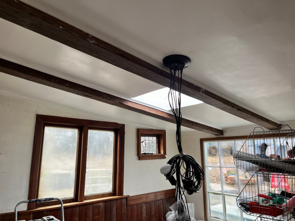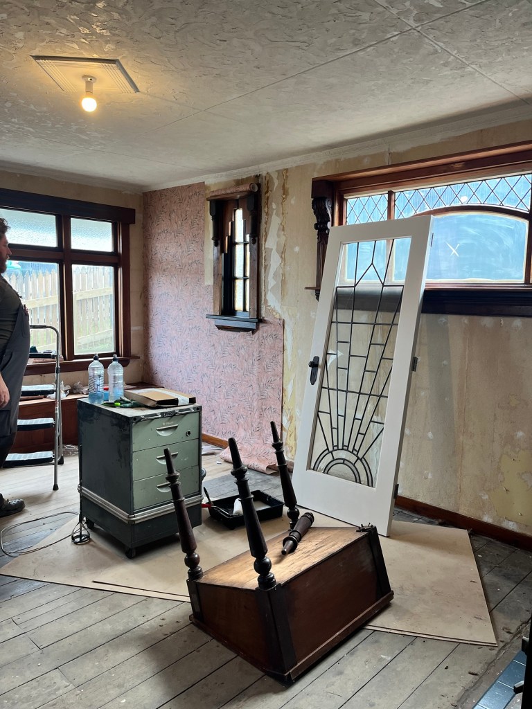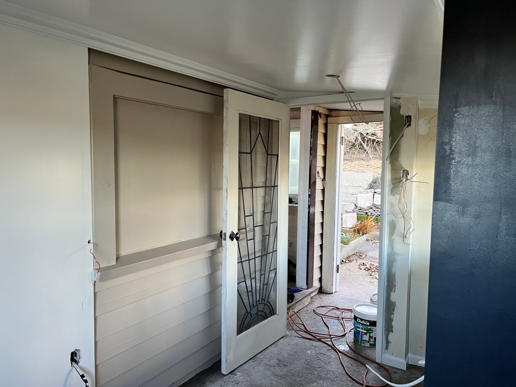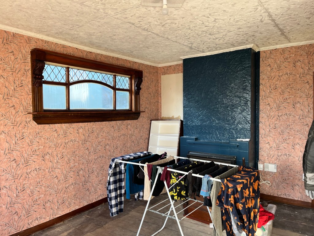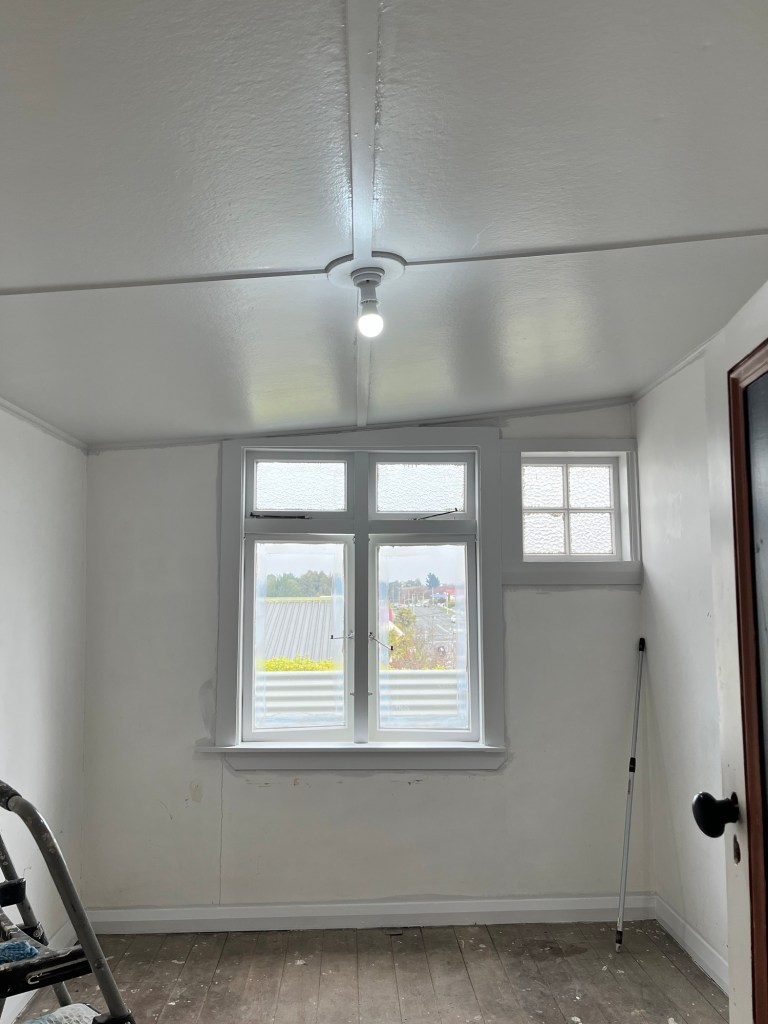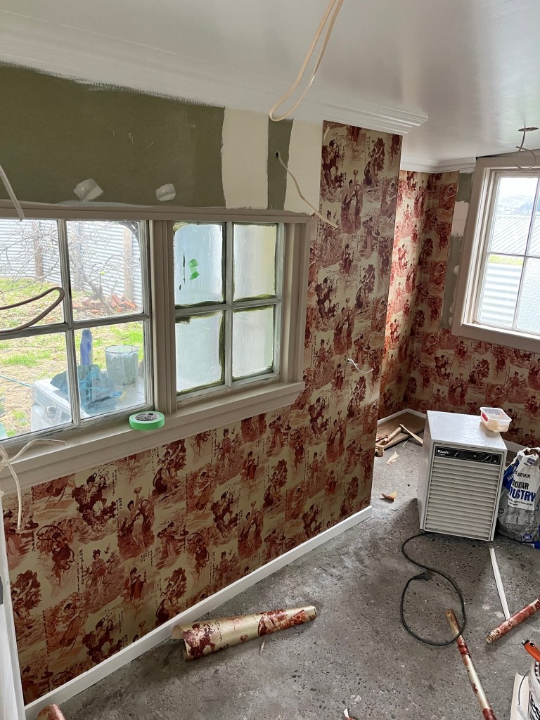 Monday; Salmon Monday. First thing you walk into now is a pink tropical surprise in Ōamaru. We had Jas and Cory working today too. Jas was prepping the dining room for wallpaper tomorrow. Cory mowed the lawns and tidied the edges. Man it looks better. He spent the rest of the day painting the fence. Rowan and I got all the wallpaper done in the living room. It had a lot of fiddly bits and it took some planning to make sure it all works. It annoys me the bit we haven’t done but that is because a shelf is going up there. It makes the room look incomplete. I will be much happier when it is up.