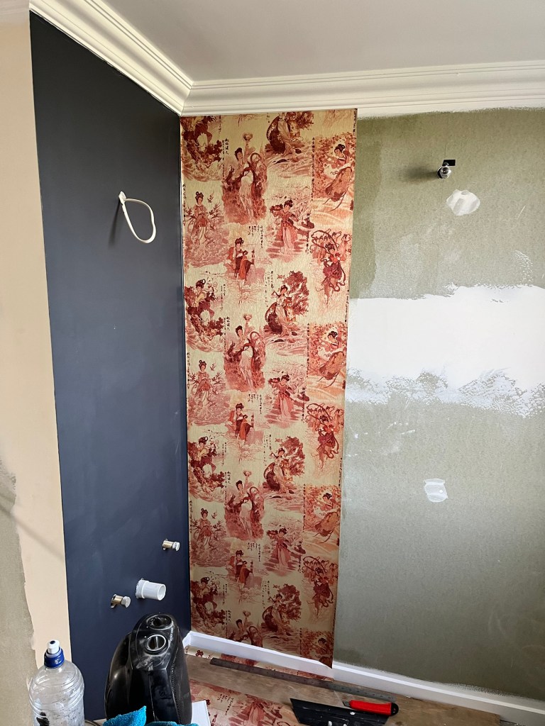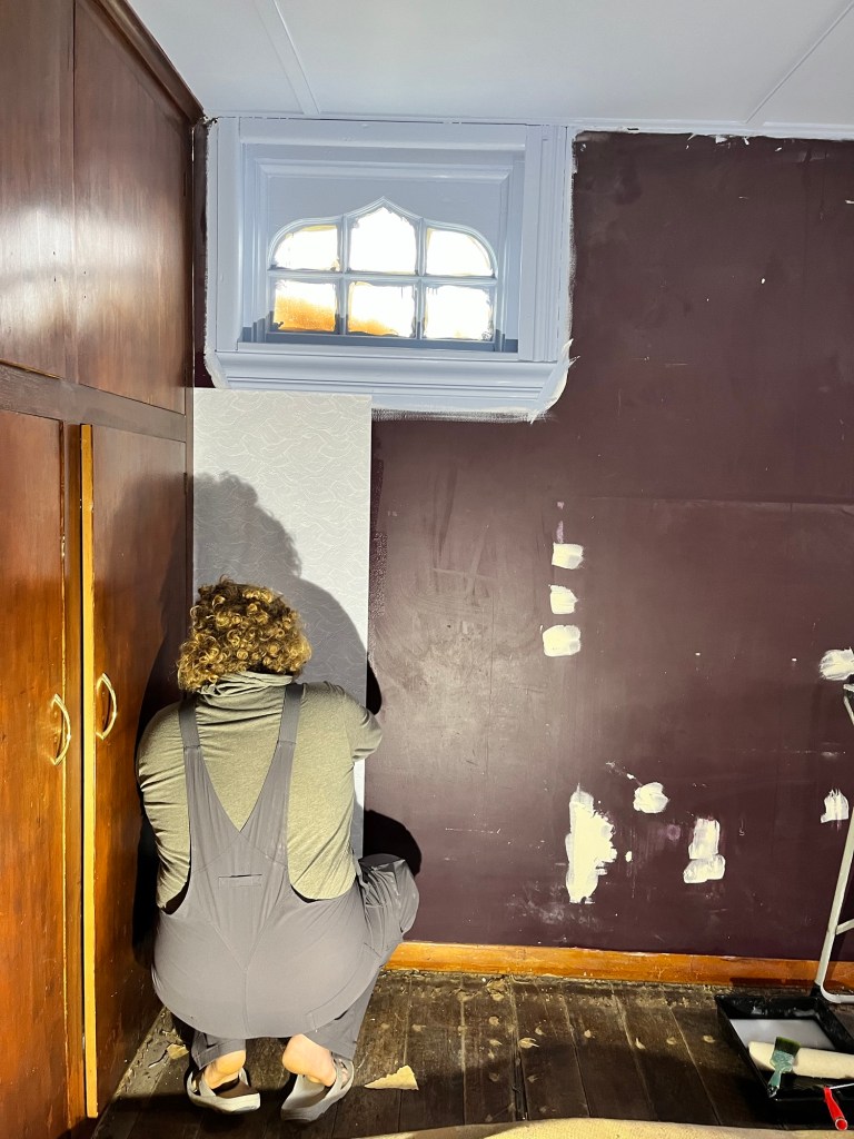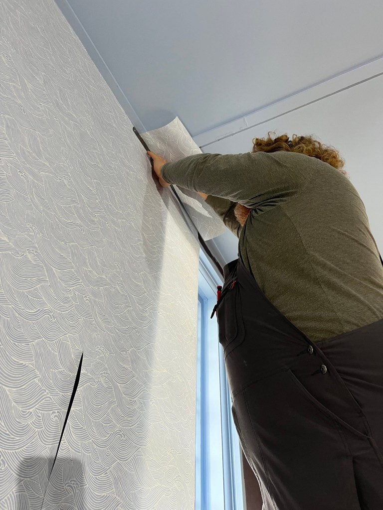 Sunday; Wallpaper day. Rowan and I have committed to getting this room done today no matter how long it takes us. This wave wallpaper is great. An awesome wallpaper that is very calming and neutral in a way. I love it so much! It is perfect exactly what I envisioned. That room was so dark with its deep purple colour that I didn’t realise how much natural light it has until we made it light and bright. We made a few mistakes but nothing we couldn’t fix and we were all done just before 5pm. It definitely had some fiddly bits but we worked as a team to get it done. Rowan enjoys wallpaper as it is like a puzzle.