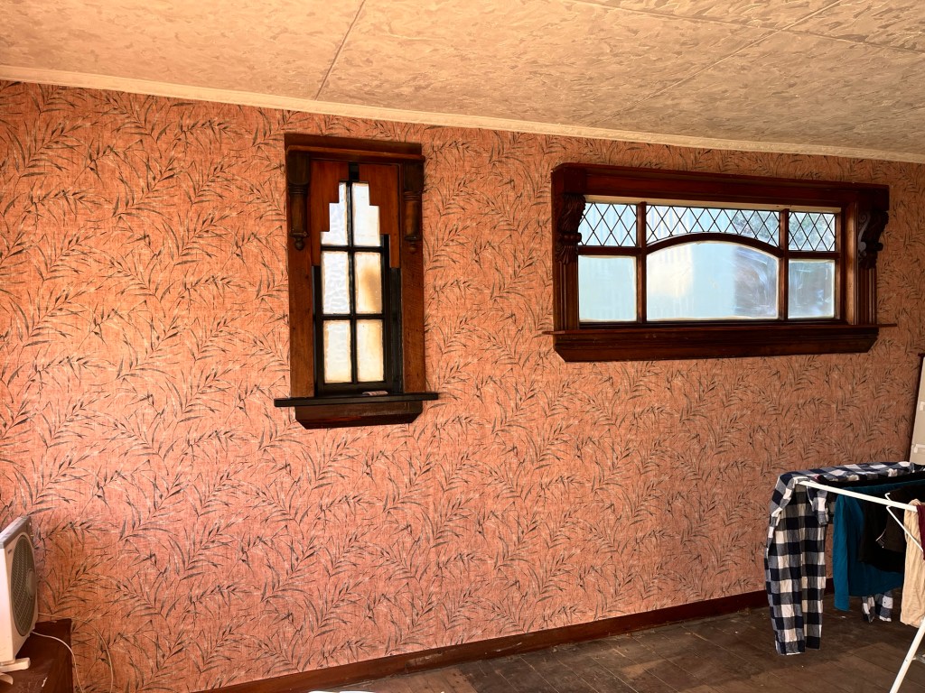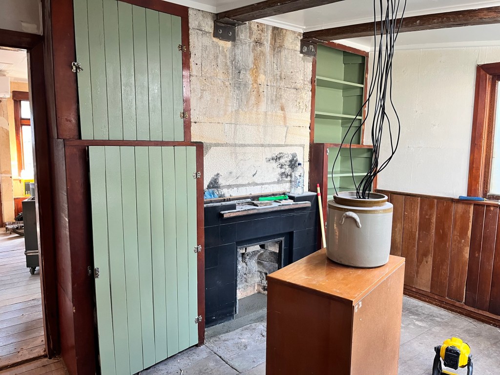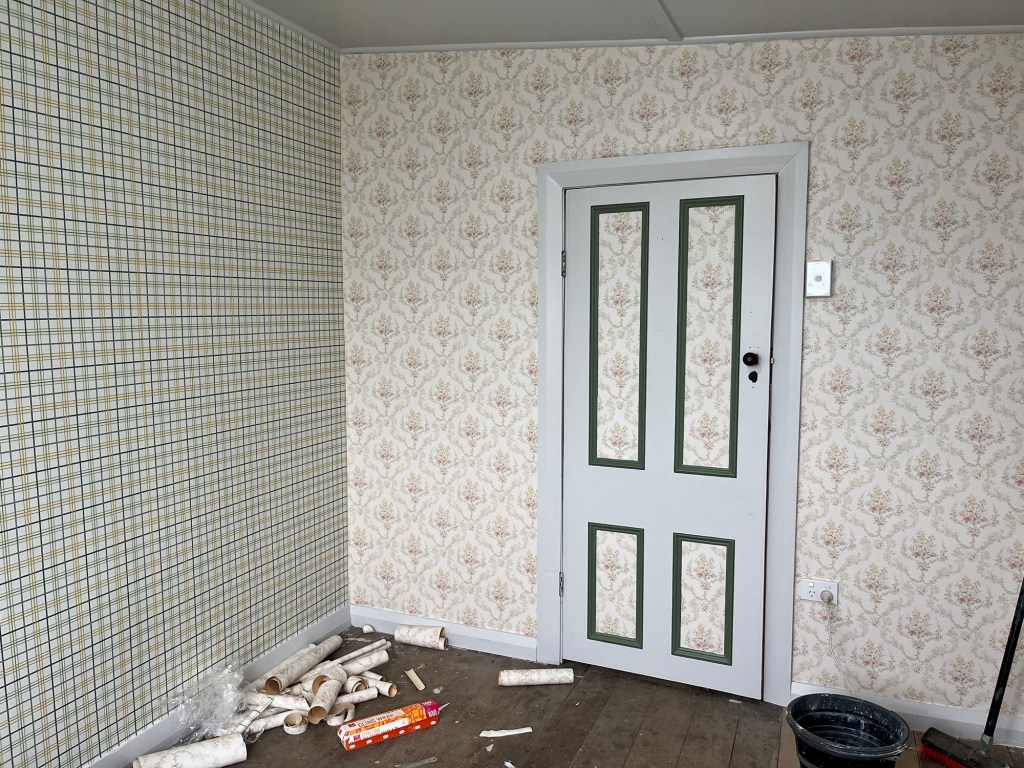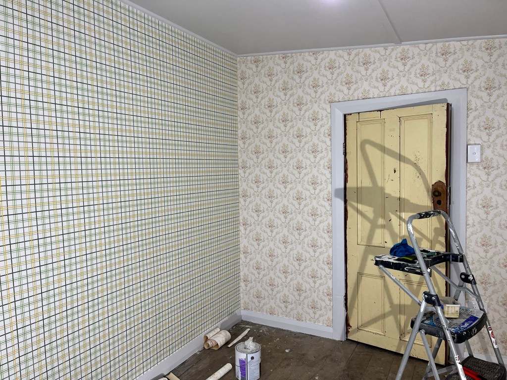 Wednesday; Dad, it is not Griffiths Plastering level but I gave it my best haha. The base of the hearth needs repair, I mortar the bricks into place and then fill in all the gaps. Now it is safe to use as an ember shouldn’t be able to get under the tile and set the whole house on fire. Now to wait for it to dry. I got a second coat of green on the window and a first coat on the cupboards and shelves. I was a bit worried with the green but it has grown on me. I wasn’t feeling motivated but decided to tackle the wallpaper in the second bedroom. This vintage gingham wallpaper is so much fun. I don’t have enough to do the whole room so we will have a clash coming!