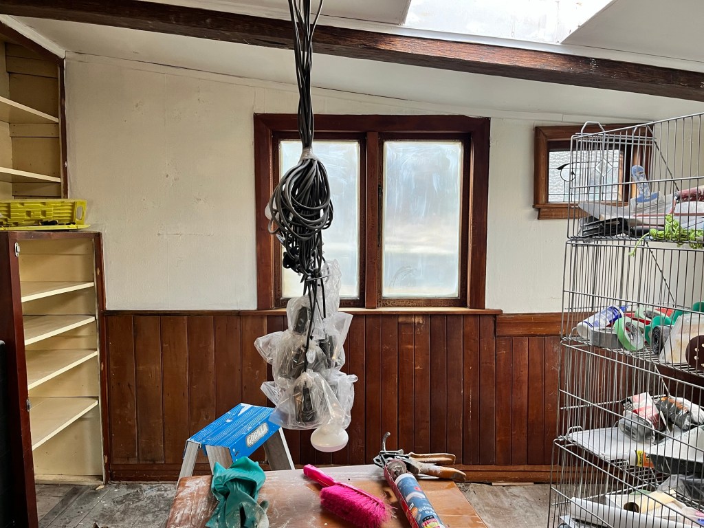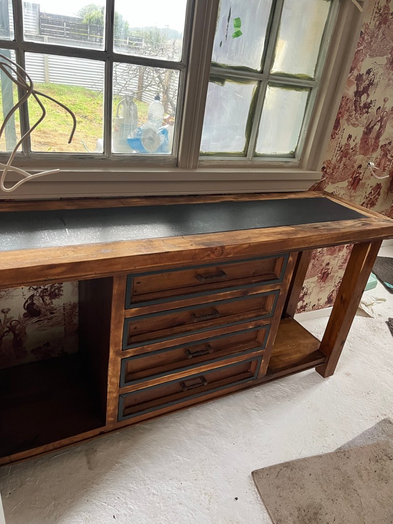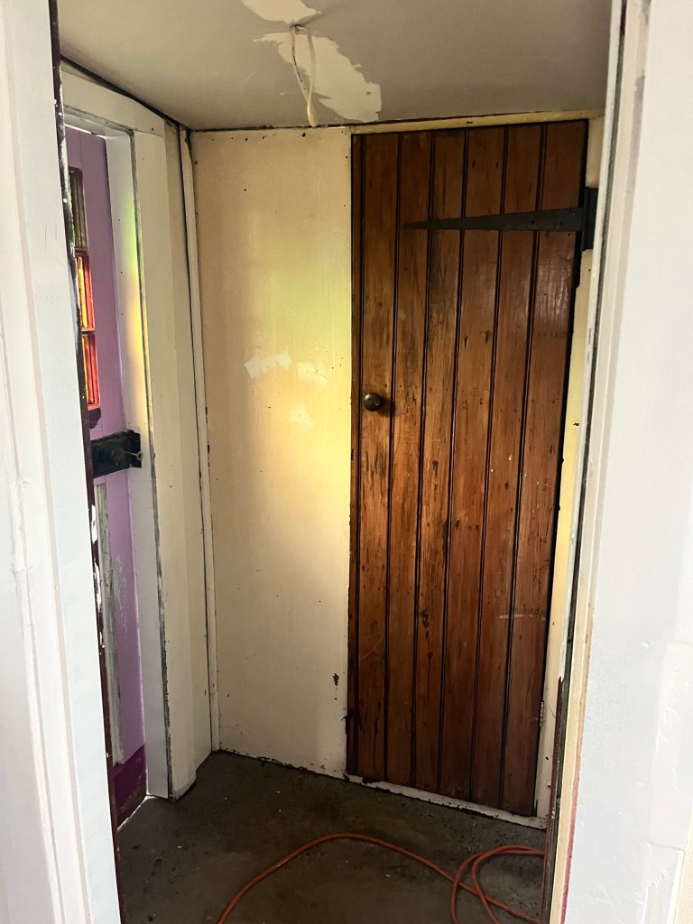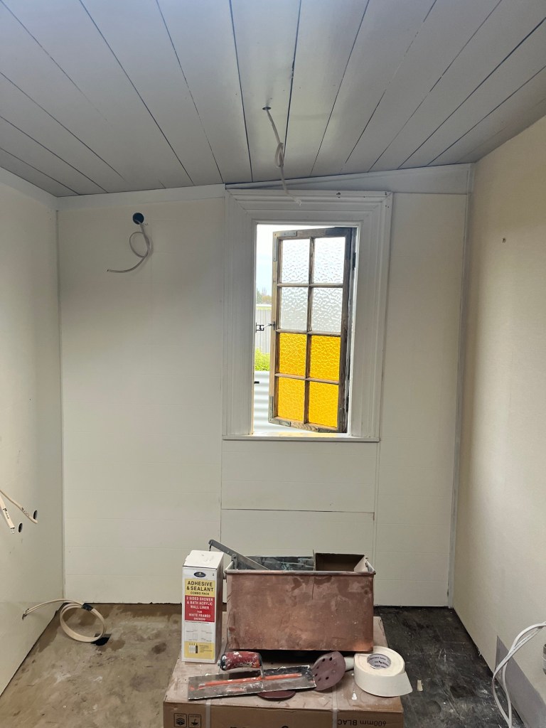 Wednesday; Dad, it is not Griffiths Plastering level but I gave it my best haha. The base of the hearth needs repair, I mortar the bricks into place and then fill in all the gaps. Now it is safe to use as an ember shouldn’t be able to get under the tile and set the whole house on fire. Now to wait for it to dry. I got a second coat of green on the window and a first coat on the cupboards and shelves. I was a bit worried with the green but it has grown on me. I wasn’t feeling motivated but decided to tackle the wallpaper in the second bedroom. This vintage gingham wallpaper is so much fun. I don’t have enough to do the whole room so we will have a clash coming!