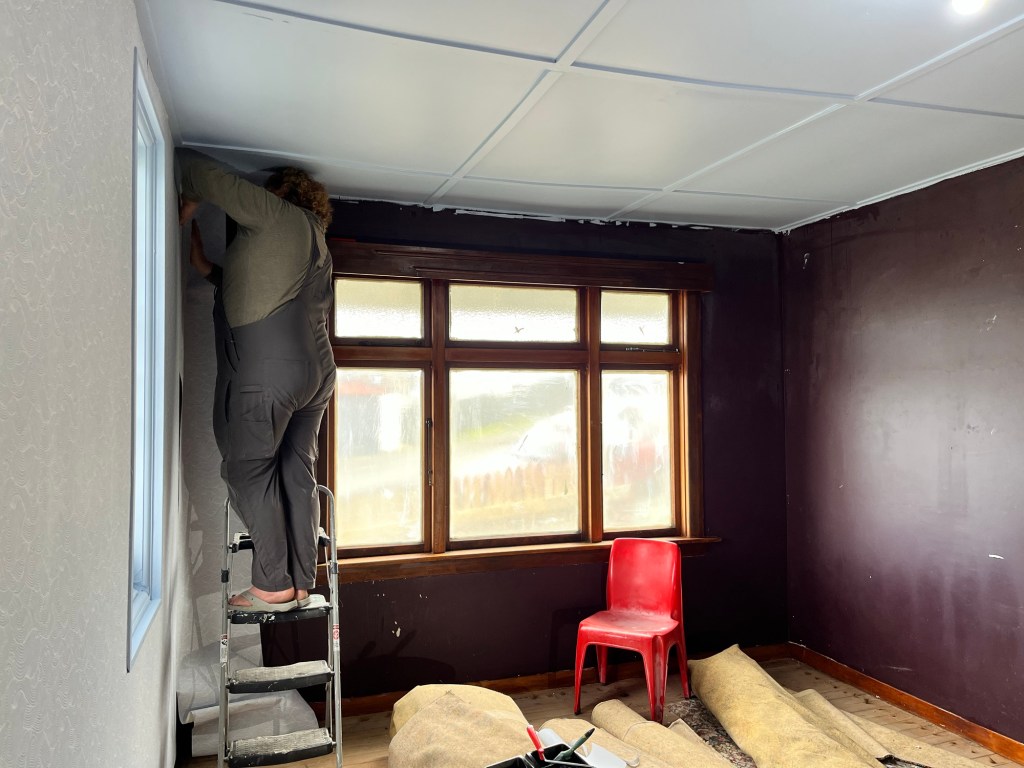 Thursday; I got the last layer of blue paint in the main bedroom. It looks a bit odd with the maroon walls. It will really change when I get the wallpaper up. We went into Professionals to get some paperwork done and have lunch with Leona. It has been a while since we caught up with her. The wallpaper clash is happening. Vintage 60s florals with vintage 60s gingham. I love it so much. It is such a clash it just weirdly works.